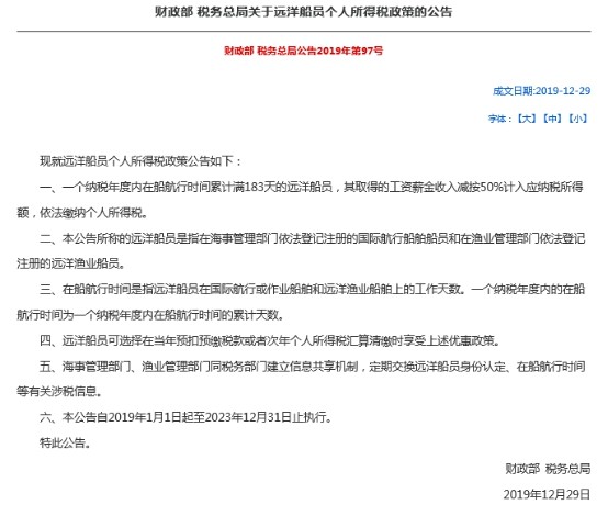 2019年11月20日,國務院常務會議決定,為促進海運業(yè)發(fā)展,借鑒國際做法,從2019年1月1日起到2023年底,對一年在船航行超過183天的遠洋船員,其工資薪金收入減按50%計入個稅應納稅所得額,2020年是第一個政策執(zhí)行年度。