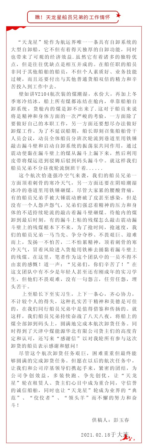 此舉得到了天津中煤能源華北有限公司貨主們的高度肯定和認(rèn)可,還寫來“感謝信”對(duì)我司所有參與這次卸貨的船員們表示感謝和慰問!